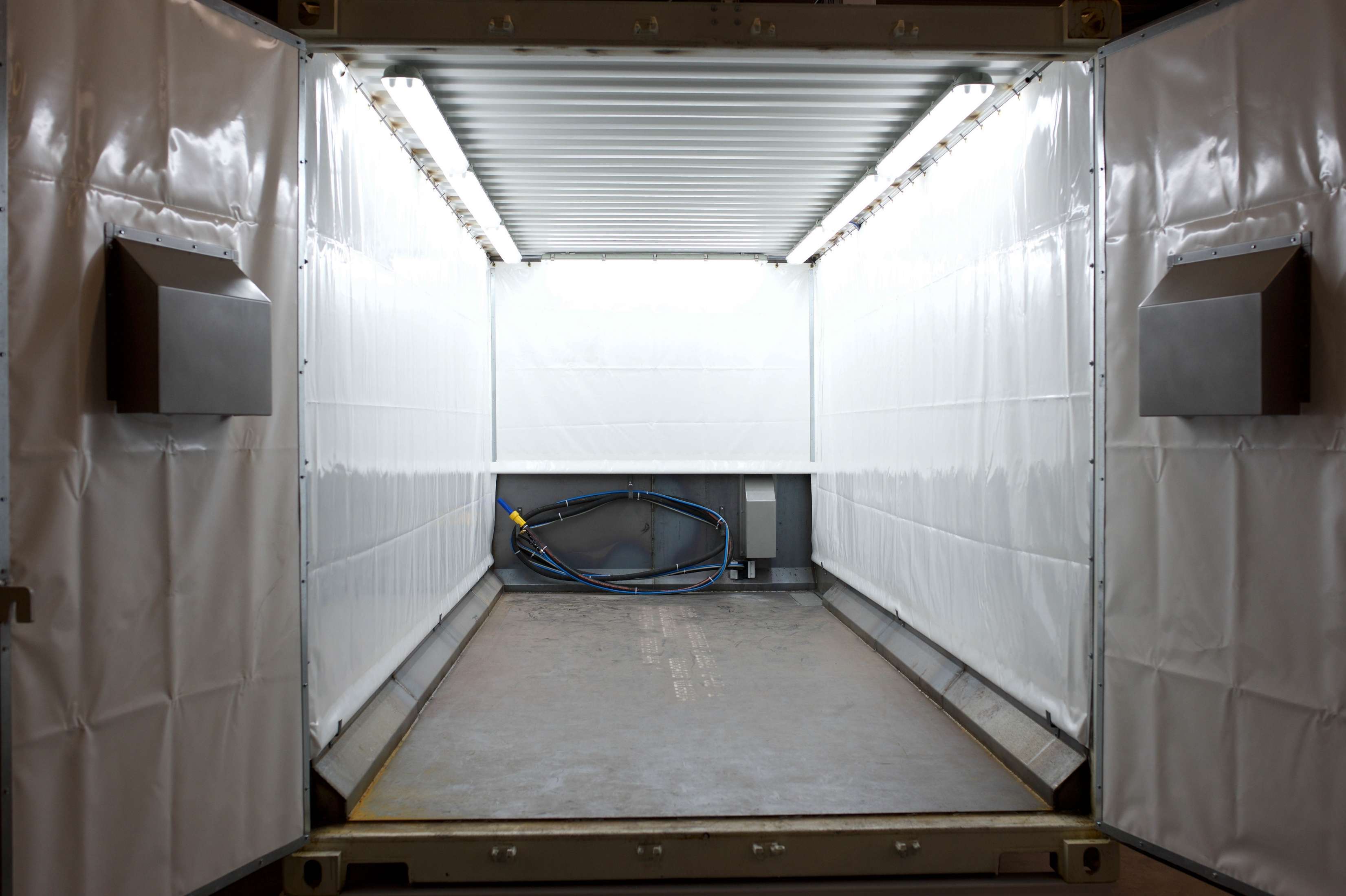 De straalcontainer is aan de binnenzijde professioneel afgewerkt met een stalen vloer, schuine stalen plint, wandbescherming en stofdichte en slagvaste verlichtingsarmaturen. Het grote voordeel van een dergelijke straalfaciliteit is dat de complete unit, inclusief de straaltechnische installatie, op een vlakke vloer kan worden geplaatst. U hoeft dus geen bouwkundige voorzieningen te treffen.